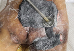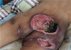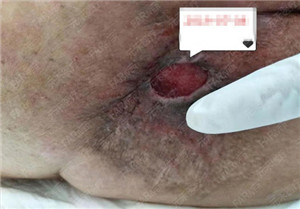 清創(chuàng)術(shù)前,臀部大面積潰爛,感染嚴(yán)重,伴隨發(fā)燒